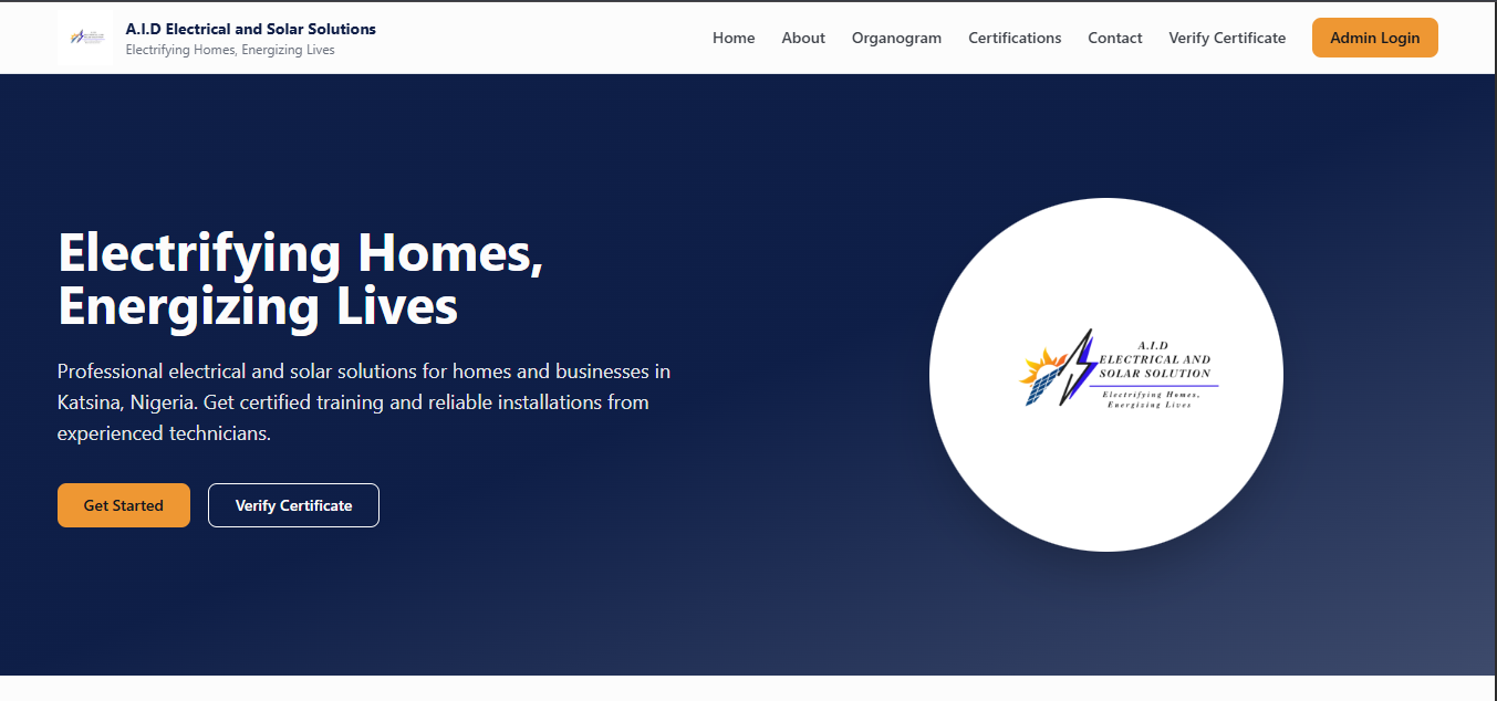 A full-stack certificate generation and verification platform for AID Electrical & Solar Solutions, featuring automated PDF creation, secure QR-based validation, and an admin dashboard.