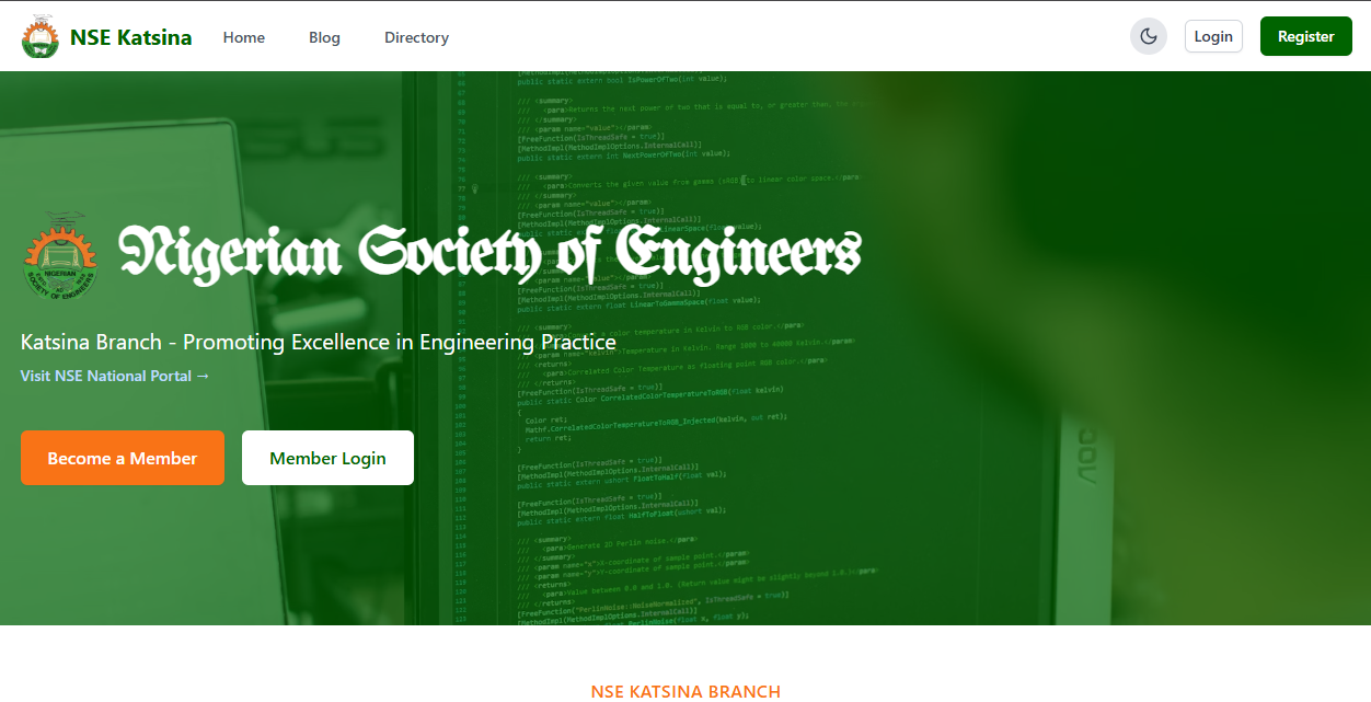 A comprehensive web portal built for the Nigerian Society of Engineers (NSE) Katsina Branch, enabling seamless member verification, profile management, digital elections, dues tracking, document library access, and a public engineering directory.